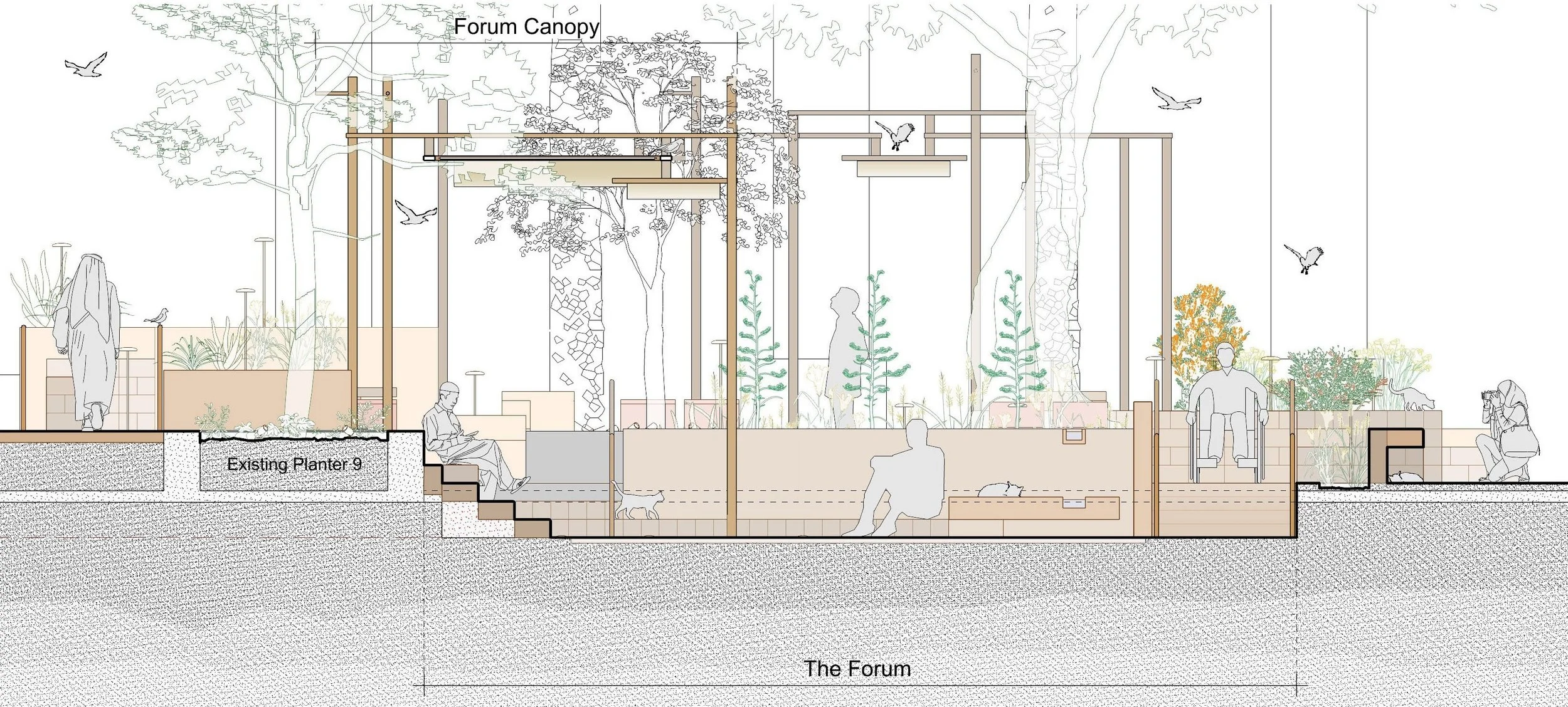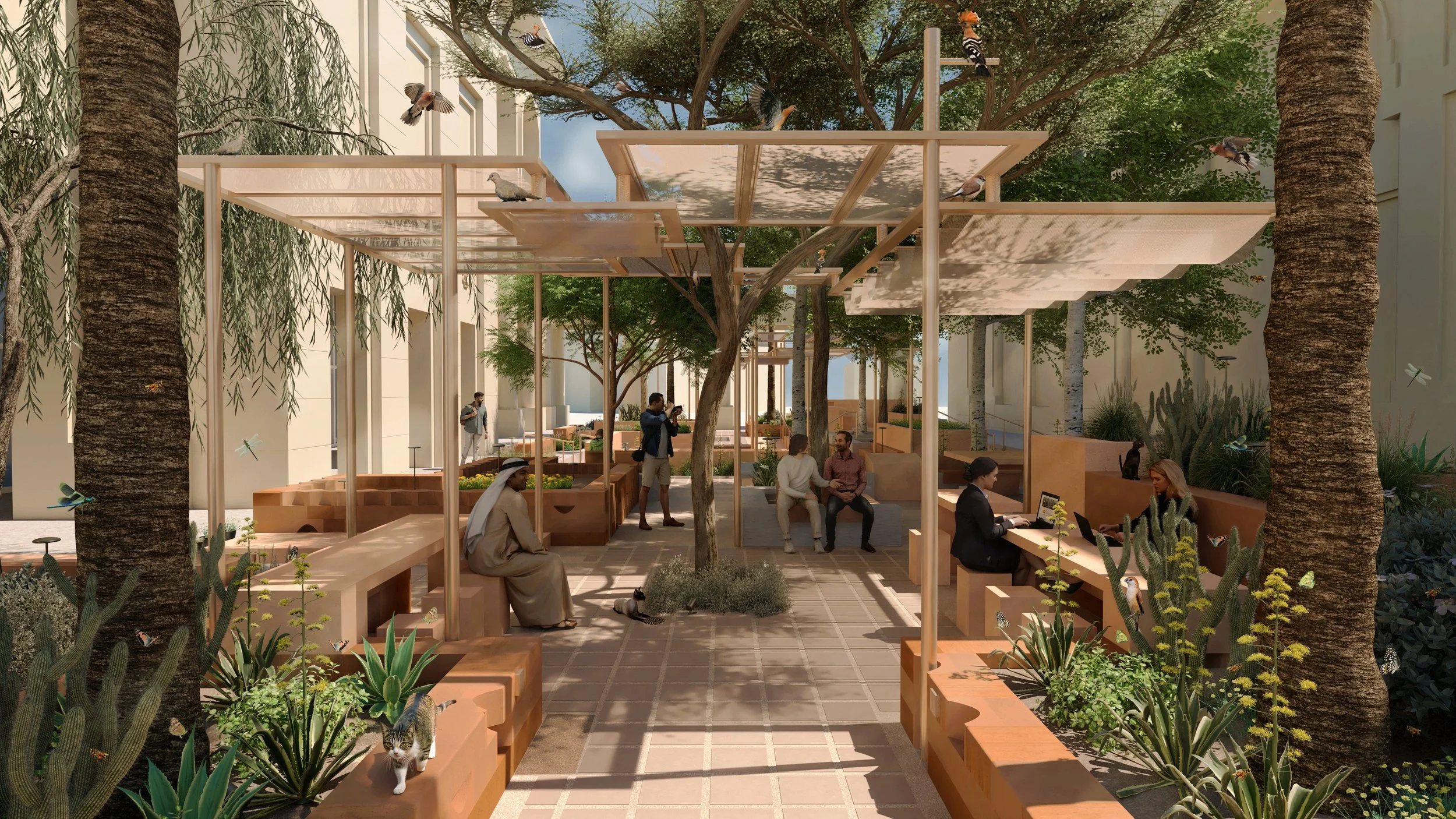 Designed and developed by AUS students of ARC497: Regenerative Design, the project builds upon a semester-long inquiry into the ecological, cultural, and pedagogical roles that architecture can play in the UAE’s shifting urban and environmental context. It proposes a series of nature-forward interventions — that expand the existing planters into an immersive arid garden that introduces 130 new seats, cast tables, shading provided by new trees and fabric canopies, new pathways, and a series of new planting beds.