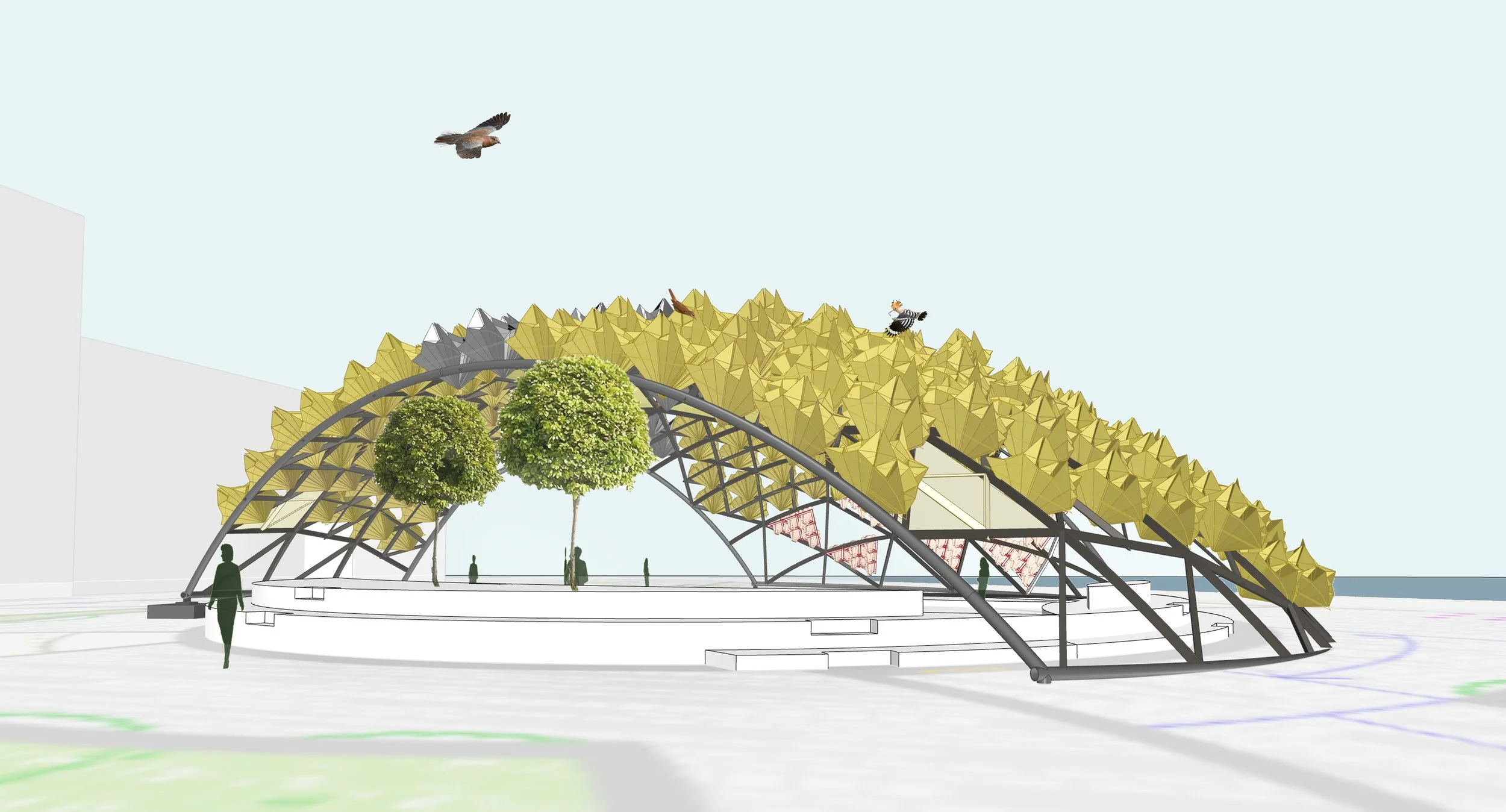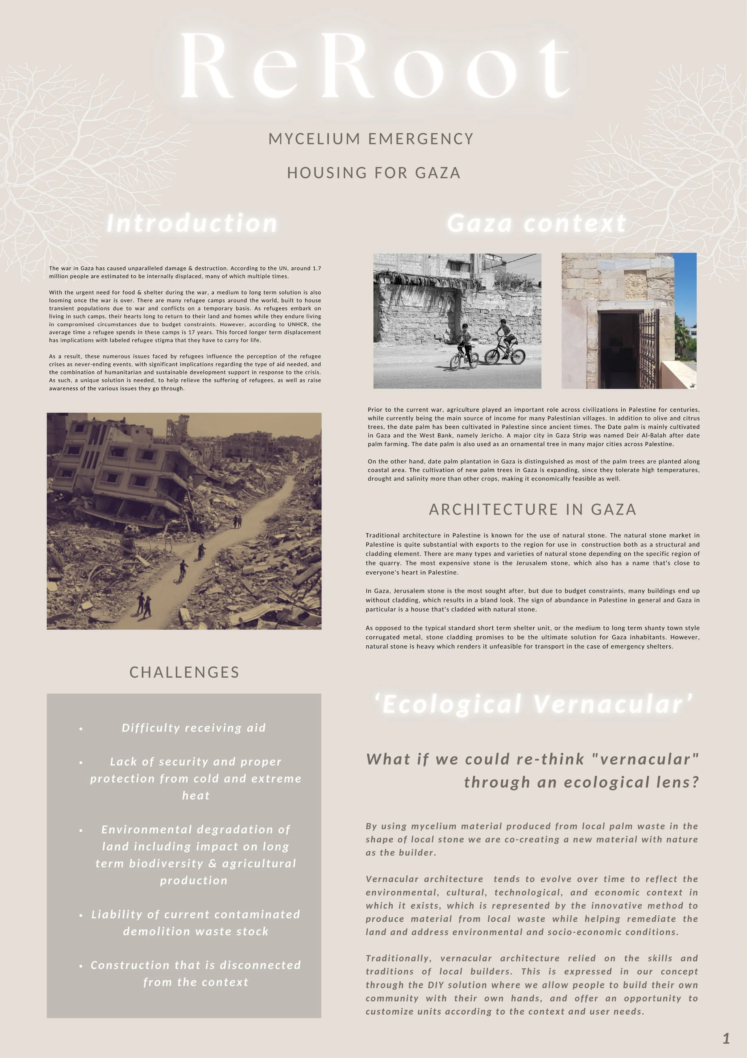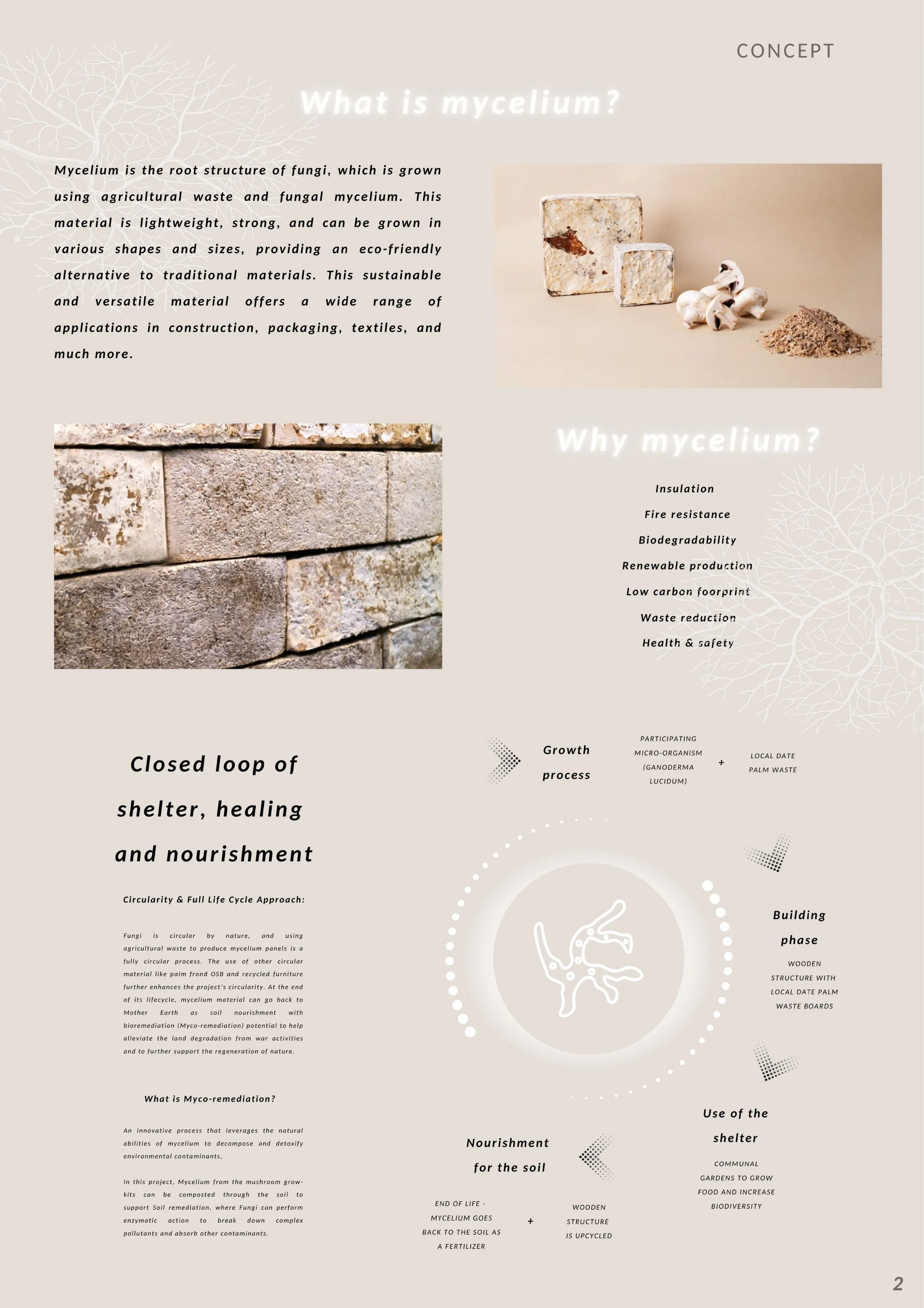 ReRoot embodies regenerative design by imagining an ecological vernacular that uses mycelium—a material derived from fungi grown on local palm waste—as a primary construction material.